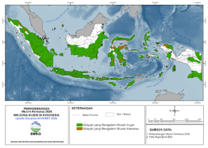 Jakarta, DepokPost.com-PascaKonferensi Pers untuk Prediksi Musim Kemarau dan Prediksi El Nino tanggal 4 Maret 2026 yang lalu, Badan Meteorologi, Klimatologi, dan Geofisika (BMKG) mencatat hingga akhir Maret 2026, sebanyak 7% Zona Musim (Z0M) di Indonesia telah memasuki musim kemarau.